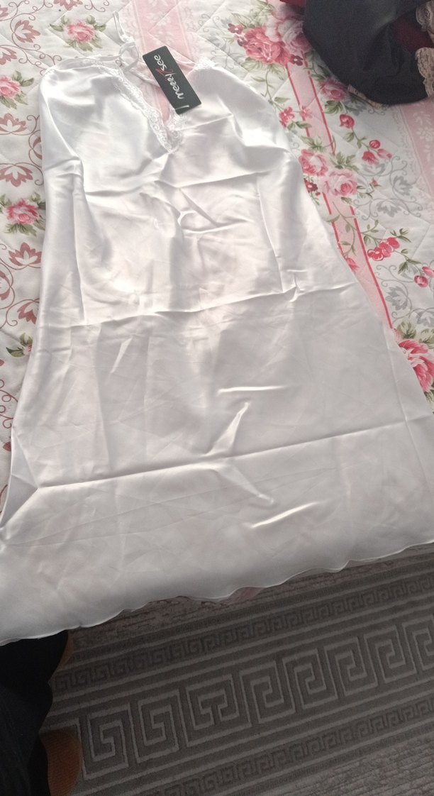 Beyaz saten gecelik, yumuşak ve parlak dokulu, yakasında ince dantel detayı bulunur. Rahat ve konforlu gece giysisi.