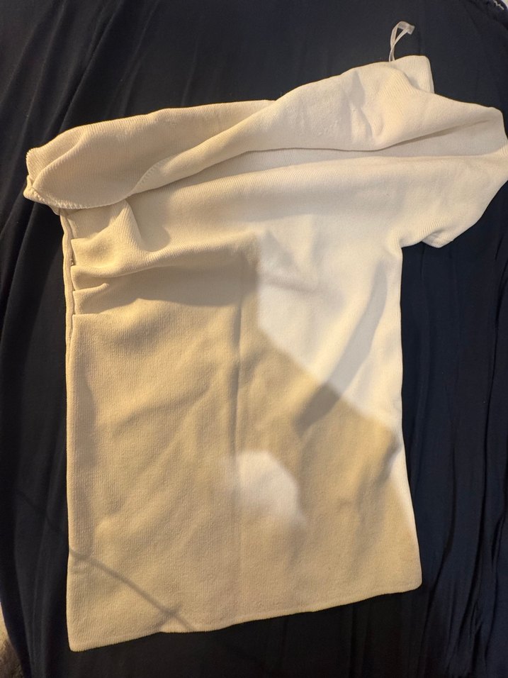 Yumuşak kumaştan yapılmış beyaz, düz sokak stili havlu, kolay saklama için askı halkası içerir. Küçük bir dikiş atma hatası mevcut ama düzeltilir