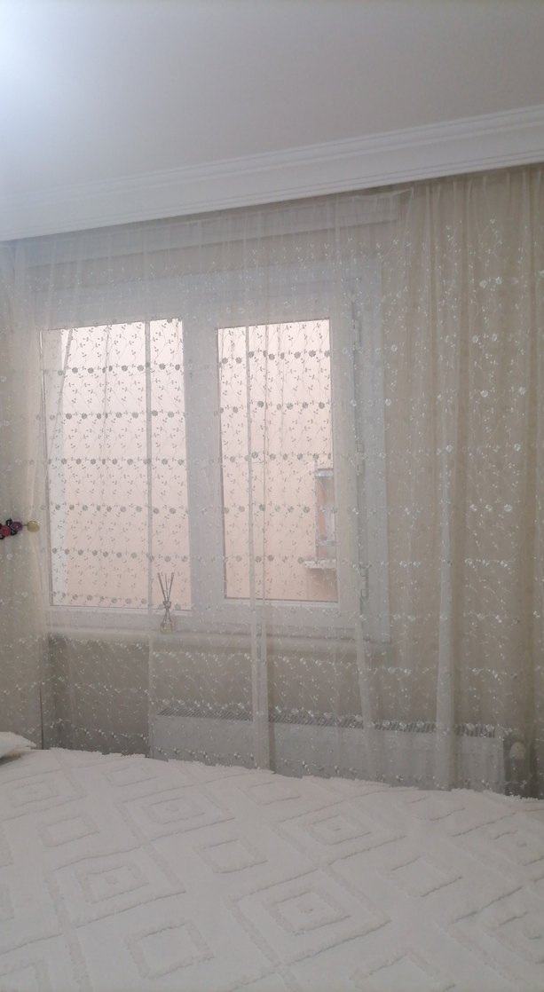 Düz beyaz tül perde, doğal ışığın yumuşakça süzülmesini sağlar. Geleneksel tarza sahip, çeşitli odalar için uygundur. birkaç düğme eksik ama göze batmiyor fazla onun dışında hasarsız eni 430üstü boyu 190
