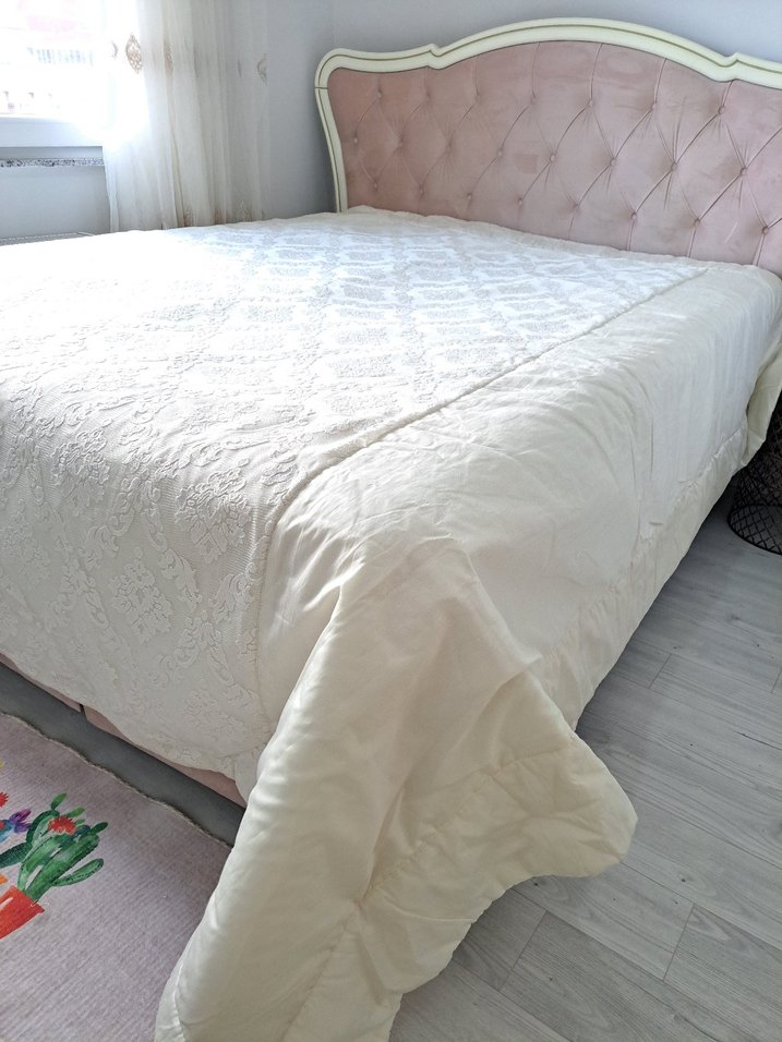 Bu beyaz yatak örtüsü, hafif dokulu deseni ve yumuşak dokusuyla yatak odasına sakin ve şık bir hava katıyor. Pastel tonu çeşitli dekorlarla uyum sağlar. ️hiç kullanılmadı.
