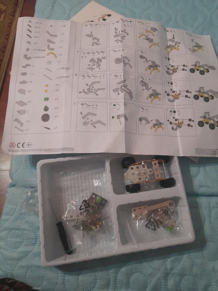 Bu beyaz eğitici oyuncak seti, çeşitli modellerin montajı için parçalar ve bir tornavida içerir, detaylı talimatlar mevcuttur.