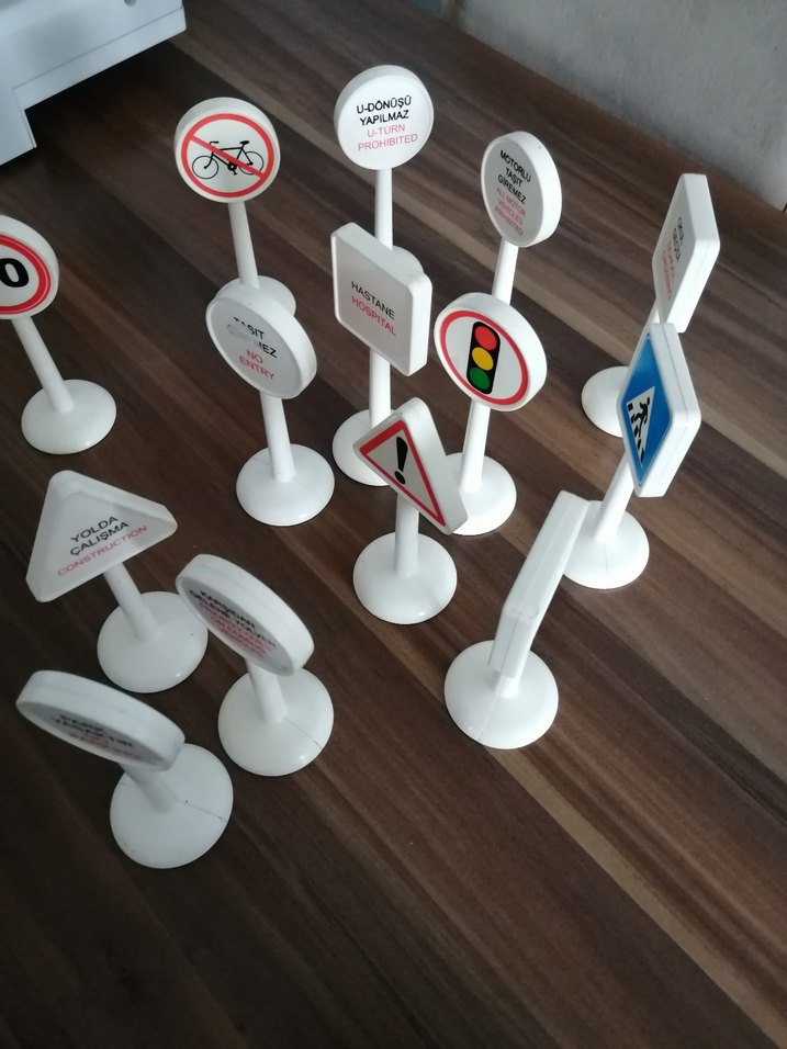 Yol güvenliği kurallarını öğretmek için beyaz mini trafik işaretleri içeren eğitim oyuncak seti. Hafif ve kolay tutulur. Ufak tefek cizikler mevcuttur fiyata yansıtılmıstır