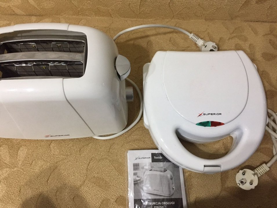 Basit kontrollere sahip beyaz ekmek kızartma ve sandviç makinesi seti, Polonya dilinde kullanım kılavuzu ile birlikte.Yurt dışından geldi sıfır ürün hiç kullanılmadı paketinde duruyor resim çekmek için açtık