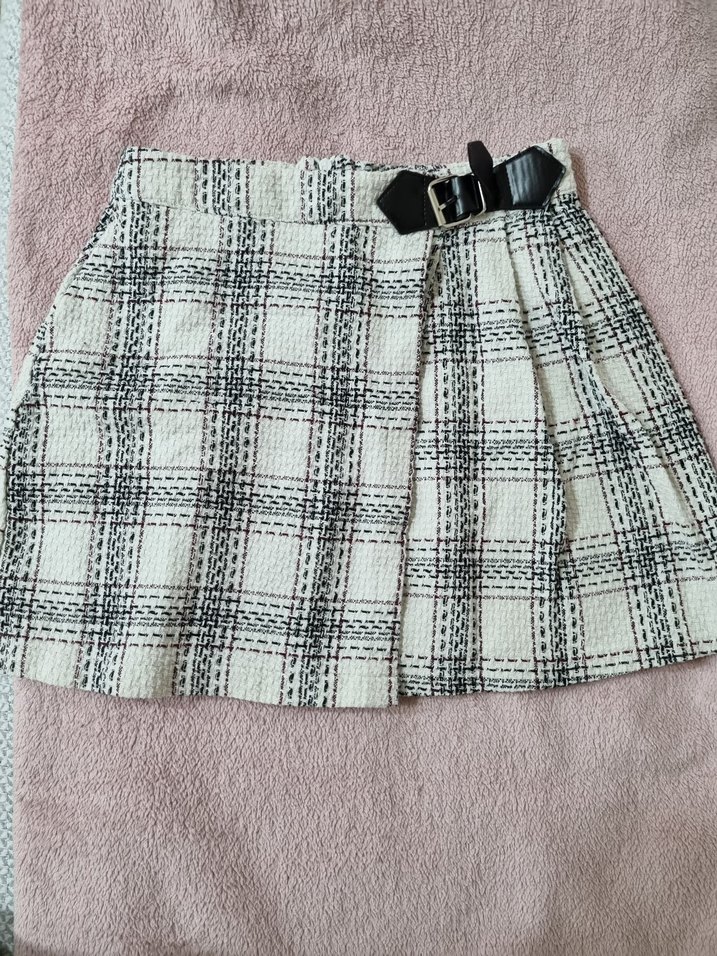 Beyaz ekose desenli mini etek, sentetik kumaştan, kemerli ve bol kesimdir. Günlük sokak modasına uygun şık bir tercihtir.