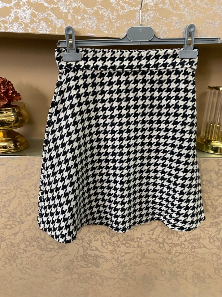 Sentetik kumaştan üretilmiş, koyu renkli ekose desenli, pilili ve bol kesim beyaz mini etek. Ofis için uygun, sokak modası tarzında.