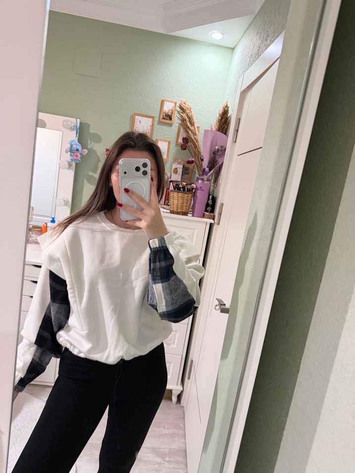 Beyaz renkli, uzun kollu, ekoseli baskılı kadın sweatshirtü. Salaş kesim ve yuvarlak yaka ile rahat bir kullanım sunar. Günlük sokak stili için uygundur.