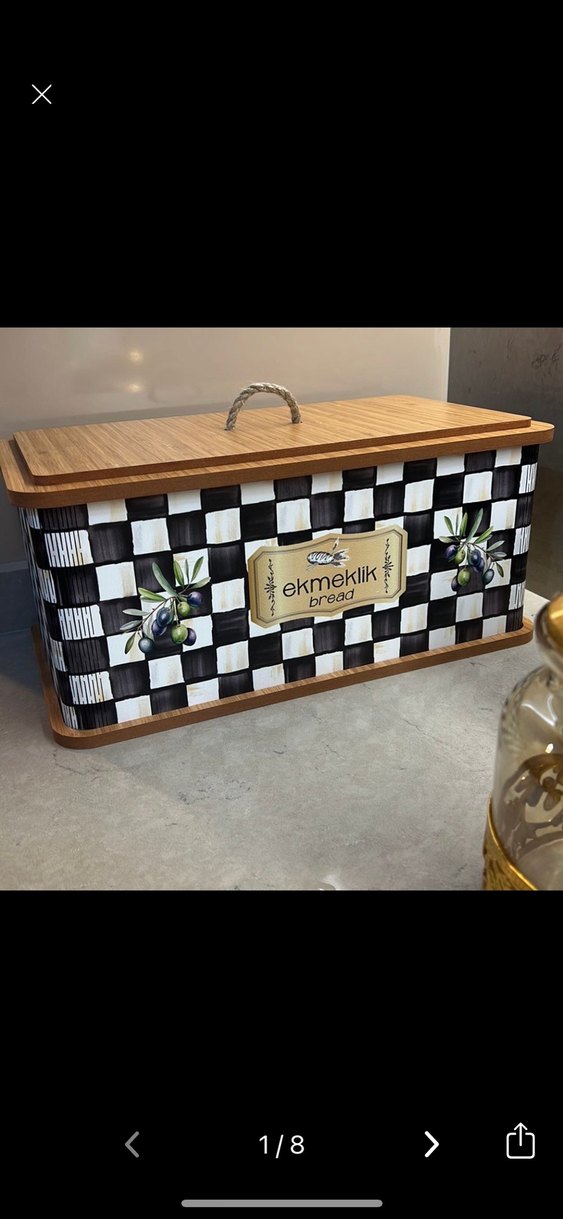 Ekru ve koyu renkli kareli dama desenli, zeytin figürlü, ahşap kapaklı ve ip saplı ekmeklik. "ekmeklik" etiketi bulunur. Mackenzie desenli mutfağına şıklık katmak için çok iyi bir dekorasyon ve ekmeklik