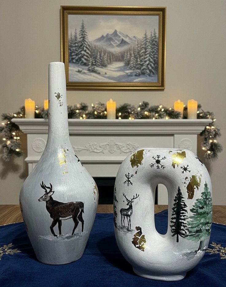Altın varak detaylı, geyik ve doğa figürlü beyaz el boyaması iki dekoratif vazo seti. Mekâna rustik bir hava katar. İkilidir. Marka temsilidir.