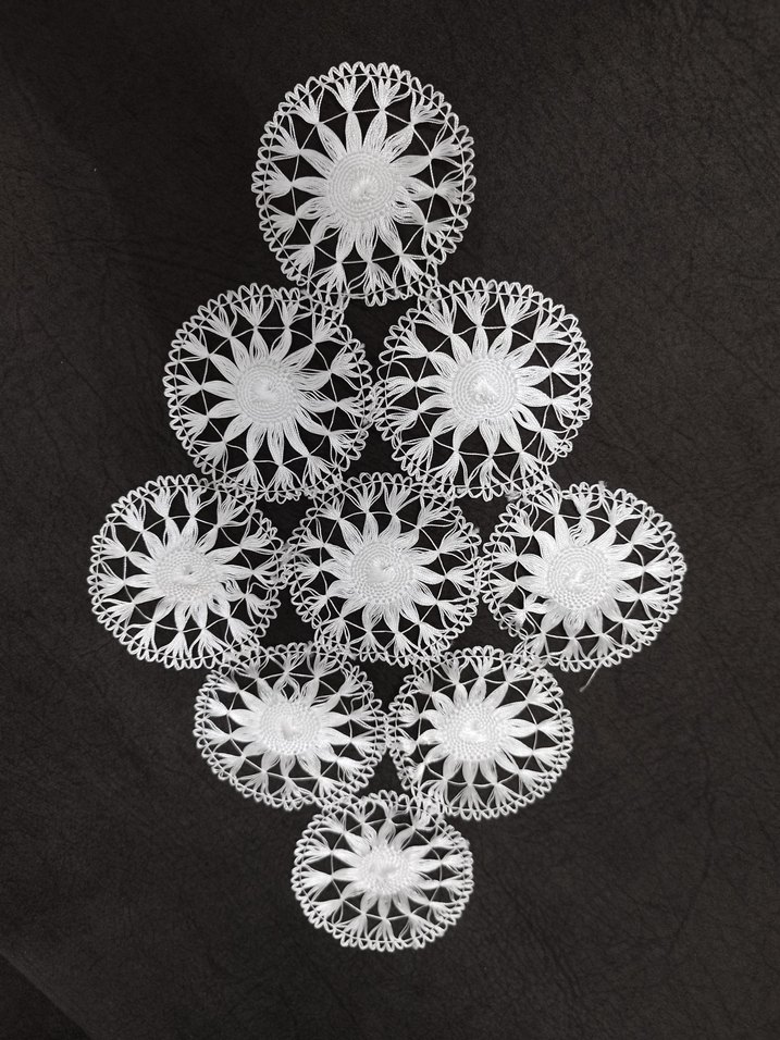 Beyaz el işi dantel masa örtüsü, geleneksel işçilikle özenle hazırlanmış dairesel desenlere sahiptir. Masanıza şıklık katar.