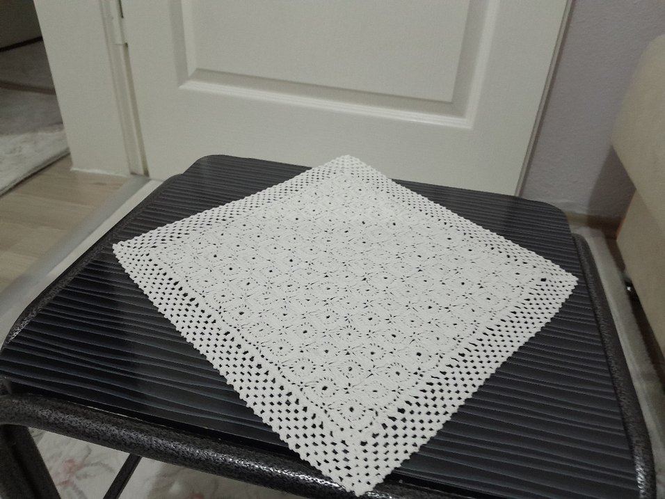 Geleneksel desenli, beyaz el işi dantel örtü. İnce kare motifler ve detaylı kenarlara sahiptir.