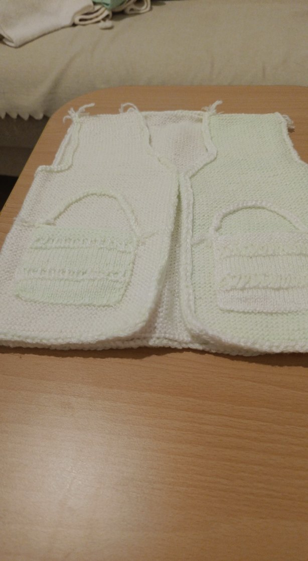 Beyaz renkte, yumuşak dokulu el örgüsü bebek önlüğü. Önde küçük bir cep ve boyunda bağlama ipleri bulunur.