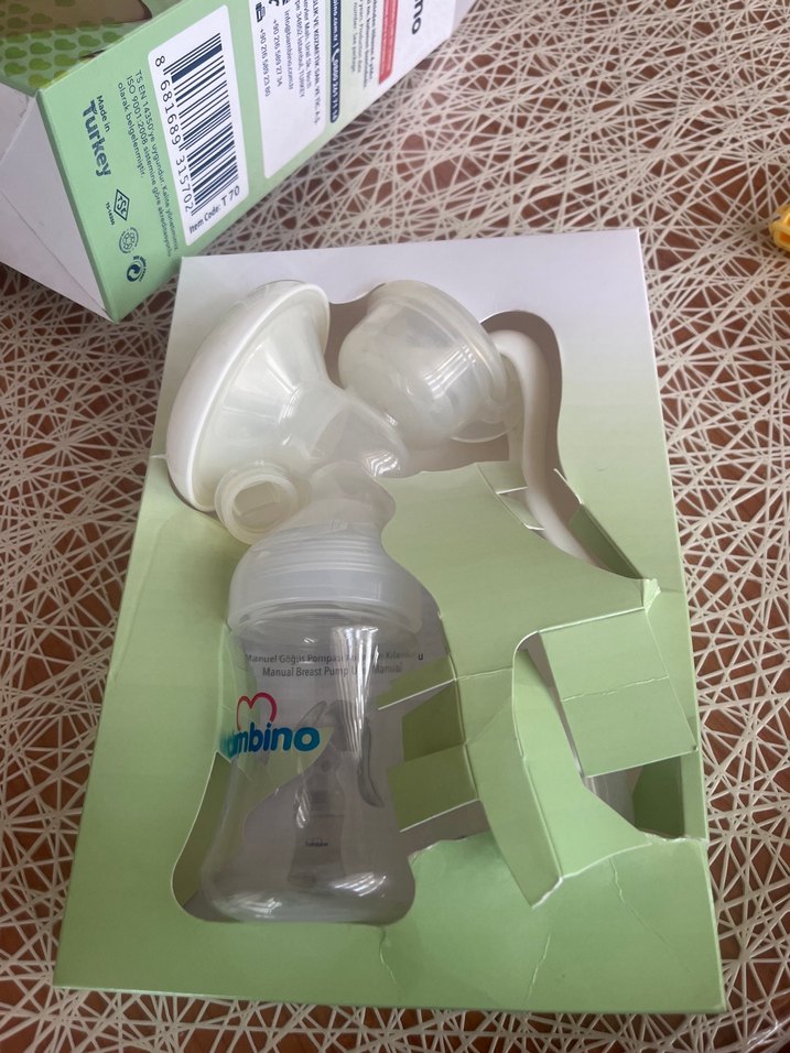 Beyaz renkte manuel göğüs pompası, rahat süt sağımı için ergonomik tutacak ve yumuşak silikon parçalar içerir.