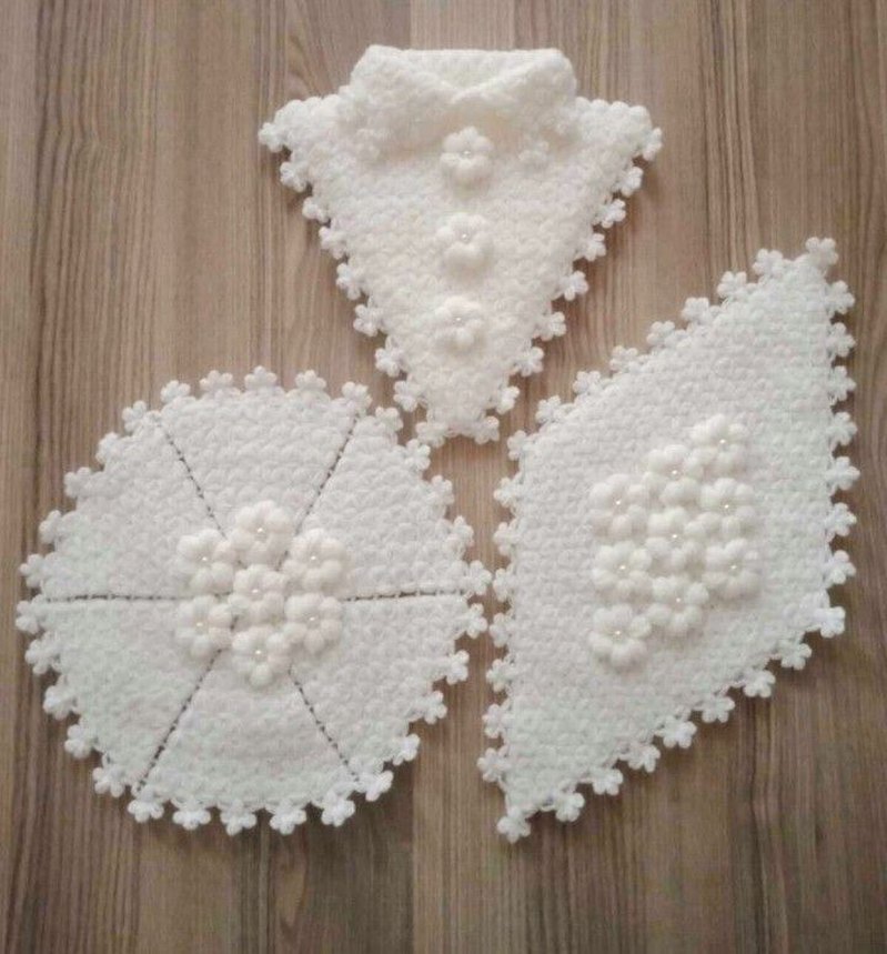 Bu set, çiçek desenli ve dokulu kenarlara sahip üç beyaz el yapımı örgü parçadan oluşur, ev dekorasyonu için uygundur.