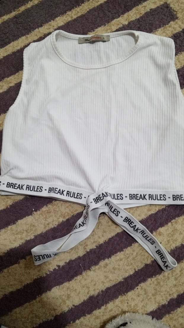 Beyaz renkli, elastik bantlı ve 'BREAK RULES' baskılı, crop yaka ve fitted kesim spor atlet. Yumuşak sentetik kumaştan üretilmiştir.