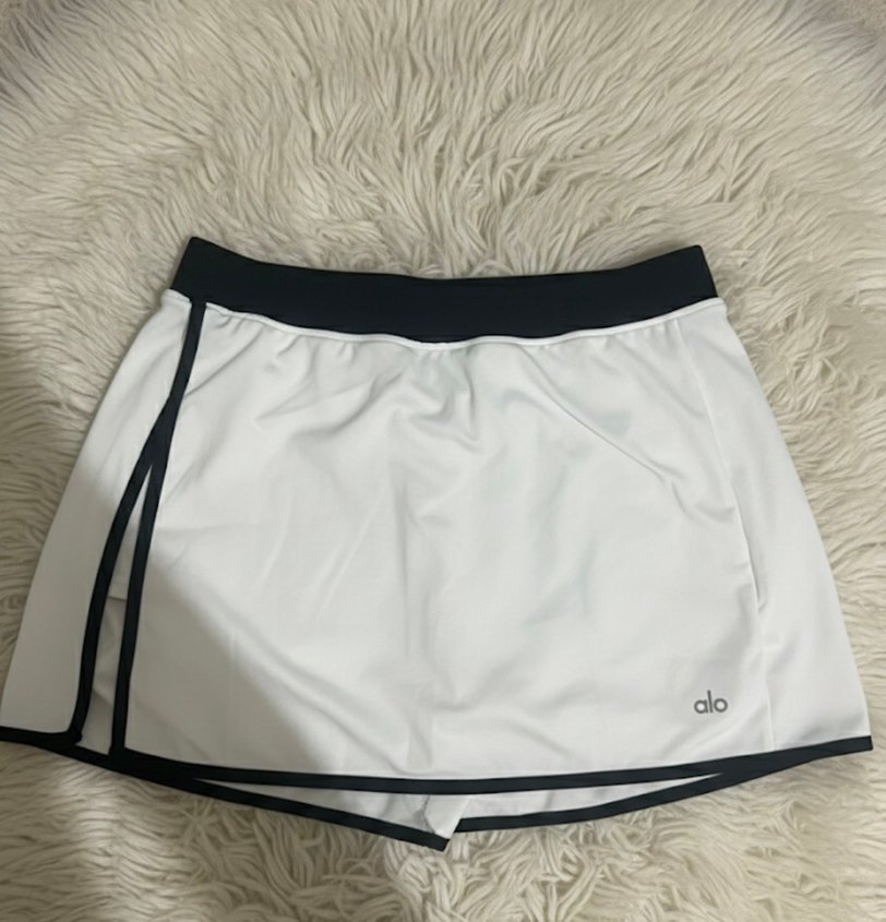 Beyaz renkte, elastik bel bantlı ve dar kesim mini spor etek. Siyah şerit detaylı, düz tasarımda ve 'alo' logosu bulunur. Spor ve sokak stiline uygundur. ♀️