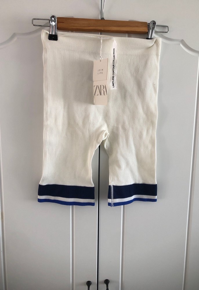 Pamuklu, elastik bel bantlı, beyaz tayt. Midi boyda, paça ucunda ince lacivert şerit detaylı, günlük kullanıma uygun sokak stili şort.