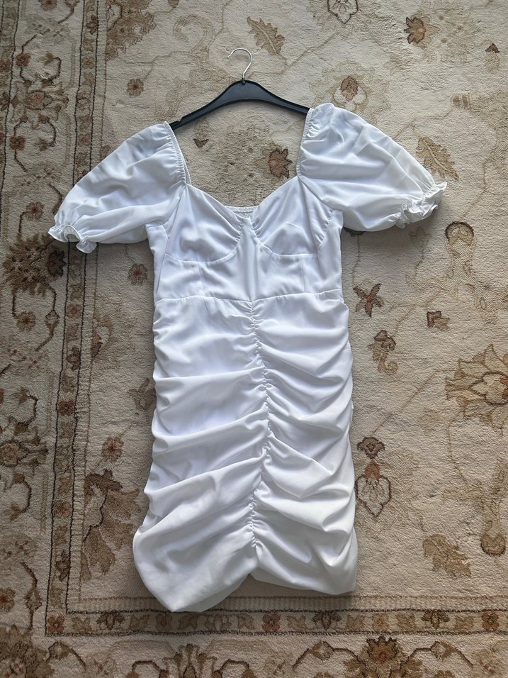 Beyaz renkli, kısa balon kollu, V yaka ve drapeli tasarıma sahip, yumuşak keten kumaştan yapılmış, Paris sokak modasına uygun mini elbise. Sorunsuz M L bedenlere uygun olur.