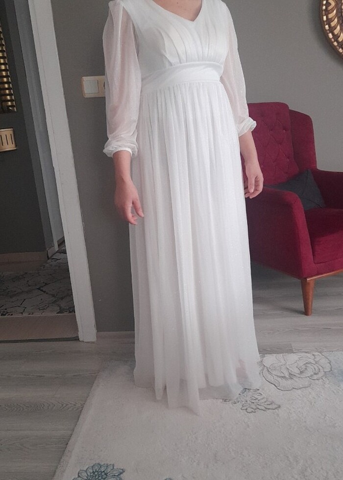 Elbisem bir kere giyildi. Nikahta giydim hiç bir sorunu yoktur. 40 ve 42 bedene uygundur.