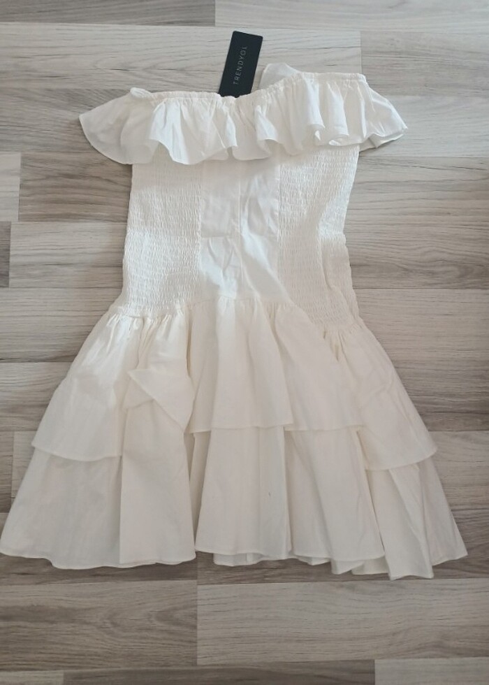 Straplez fırfır detaylı onu lastikli açılır kat kat mini elbise m beden arkasi fermuarlı yeni ürün ..s..m beden uyumludur