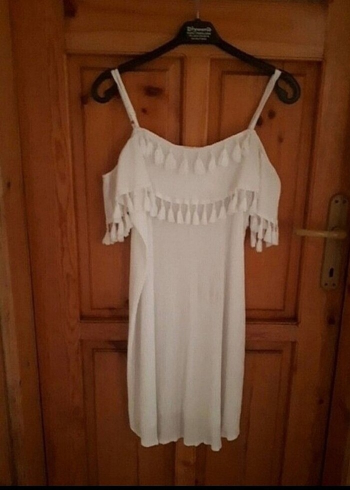 yazlık Düşük omuzlu beyaz trendyol marka yazın plajda giyilebilecek hafif ve serin tutacak püsküllü, 38 beden şık ve gösterişli bir elbisedir. Sadece bir sezon giyildi o da çalıştığım için aralıklı olarak plaja gittiğimde giydim. az giyildi temiz üründür.
