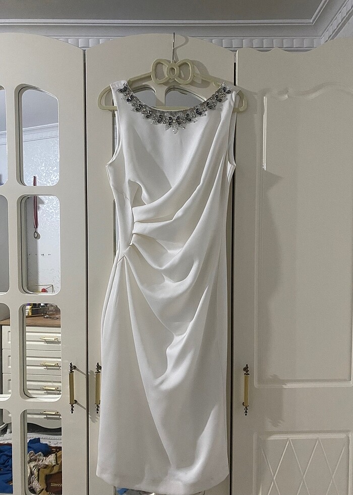 Ürün etiketli hiç giymedim kullanmadığım için satıyorum elbisenin içinde kendinden astar vardır iç göstermez beli 32 cm boyu 102 cm