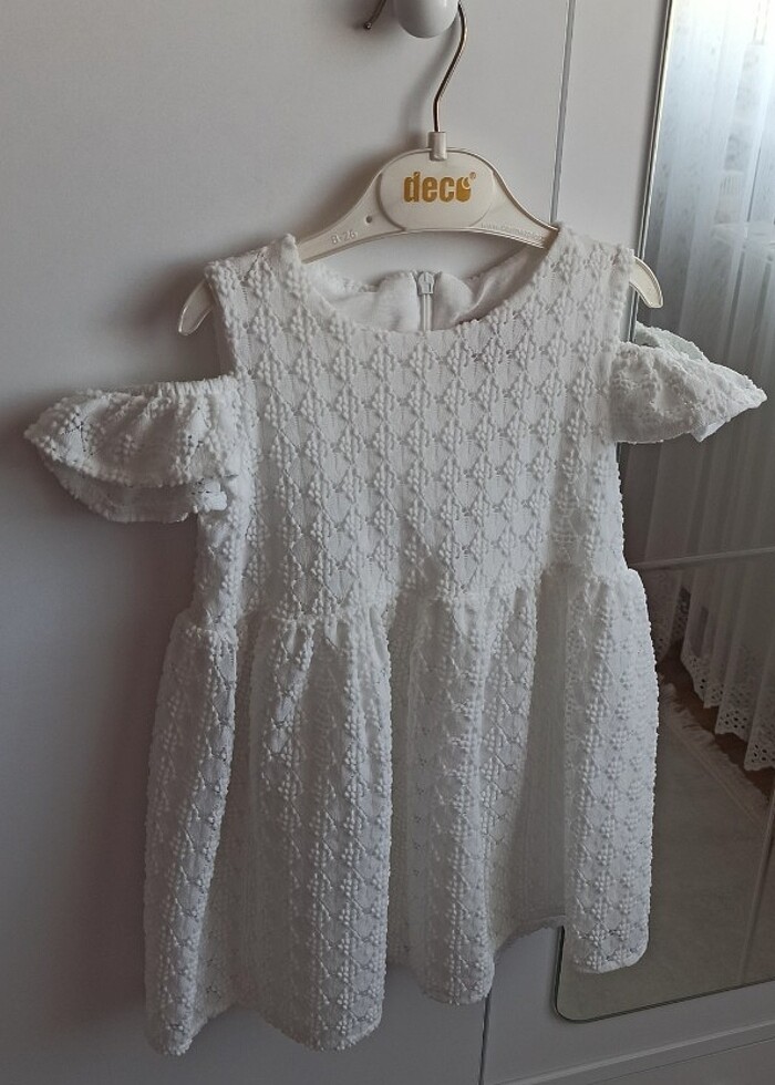 Kendinden kabartmalı, omuz detaylı çok cici bir elbise. Beyaz renk 12-18 ay için uygundur. Teklif verin fiyatta anlaşalım