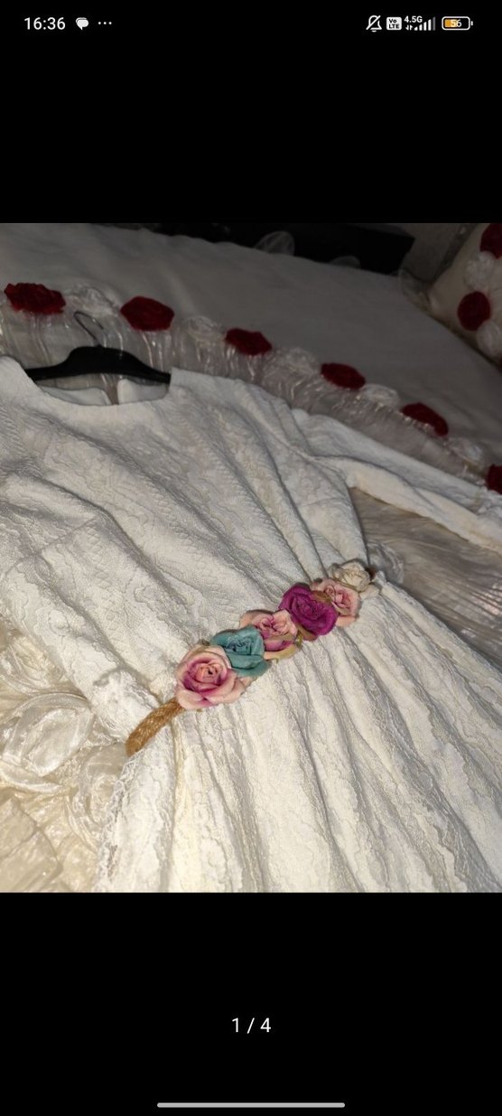 Nakışlı detaylara ve fırfırlara sahip, halter yakalı, bohem tarzda beyaz elbise. Çiçekli kemer detayı bulunur.
