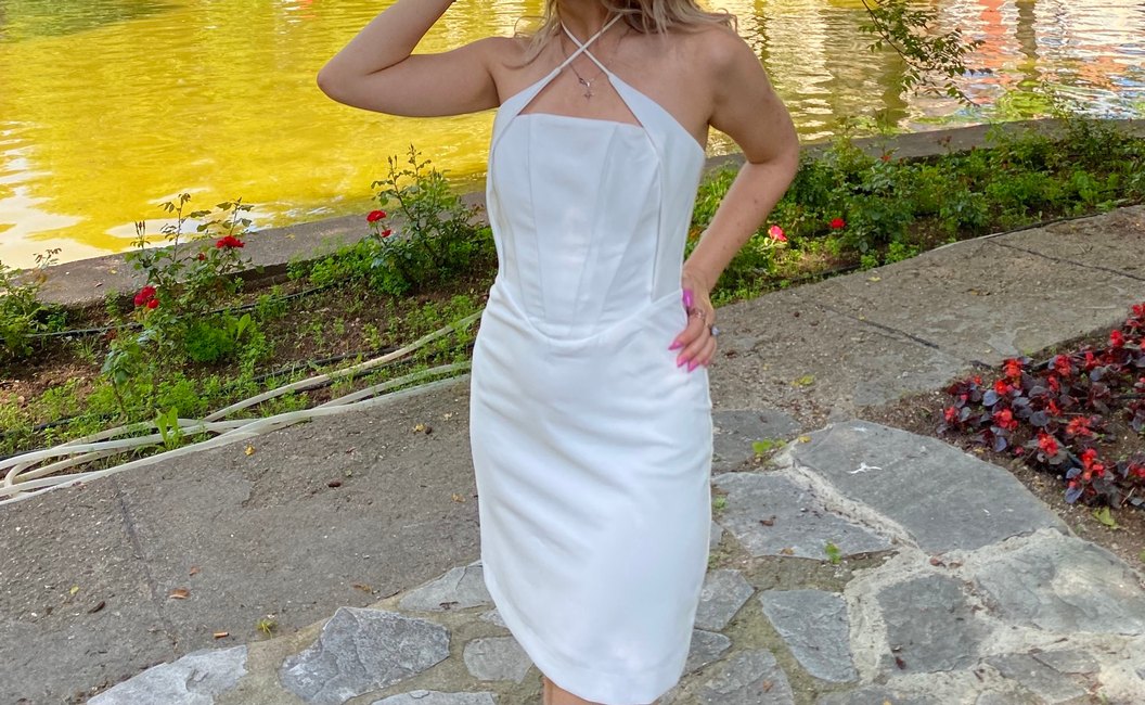 Bu beyaz mini düğün elbisesi, straplez yakası ve ince askılarıyla Parisian tarzda, dar kesim midi boyda şık bir tasarım sunar. Mezuniyetimde giydim bedeni s üstü korseli trendyol etiketli fakat bedenini değiştirmeden modelde değişiklikler yaptırdım herhangi daraltma vesaire yapılmadı.
