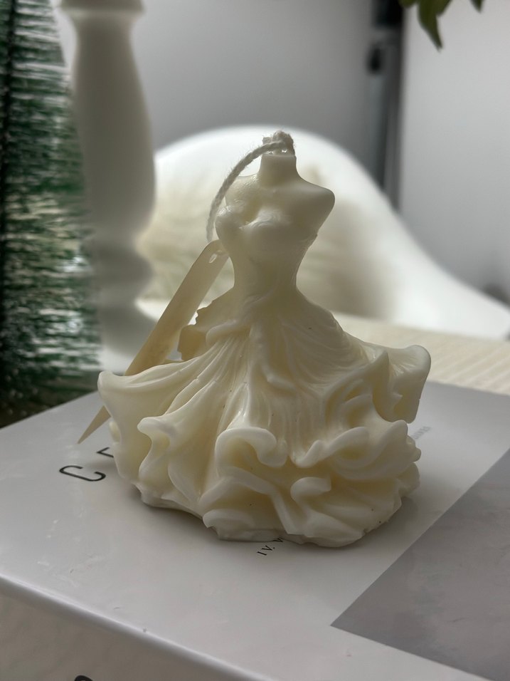 Kabarık detaylara sahip beyaz, elbise şeklinde dekoratif mum. Mekanlara zarif bir dokunuş katar.tamamı vegandır