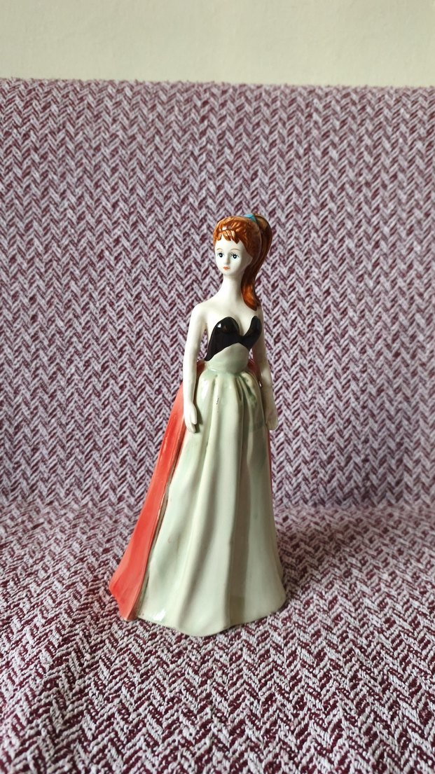 Bu figürin, beyaz elbiseli ve koyu detaylara sahip bir kadını zarifçe betimliyor. Detaylı yüz hatları ve akan etek tasarımı bulunur.
