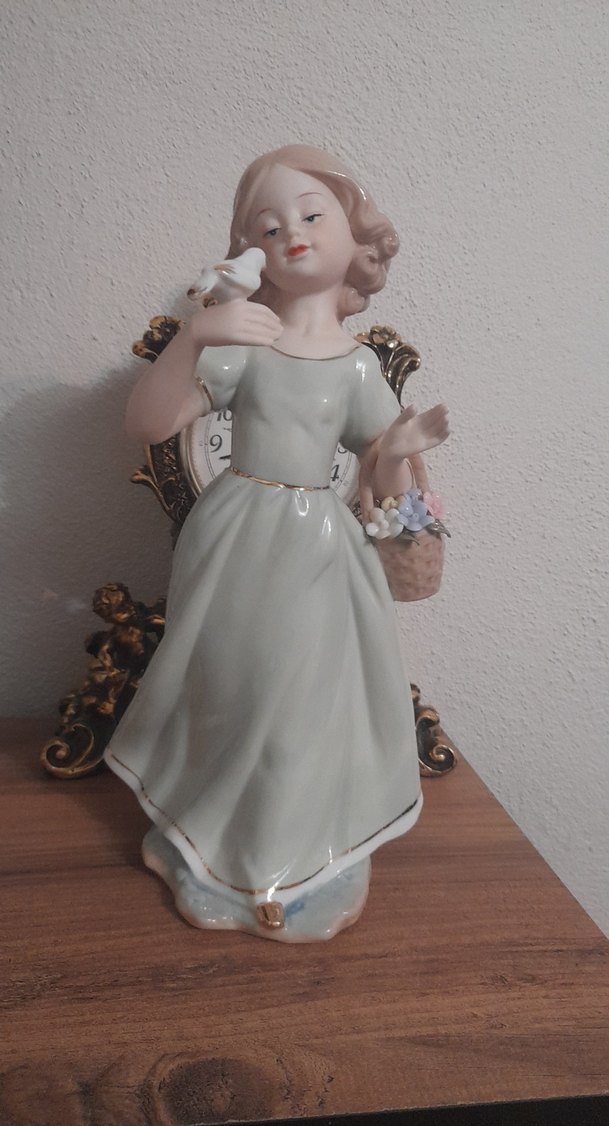 Çiçekli sepet tutan ve elinde kuş bulunan beyaz elbiseli kız figürü, zarif detaylara ve yumuşak bir görünüşe sahiptir. ️ koleksiyonerler dusunebilir kusursuz kırık çatlak yoktur elbisesi hafif şu yeşili pastel tonlardadir