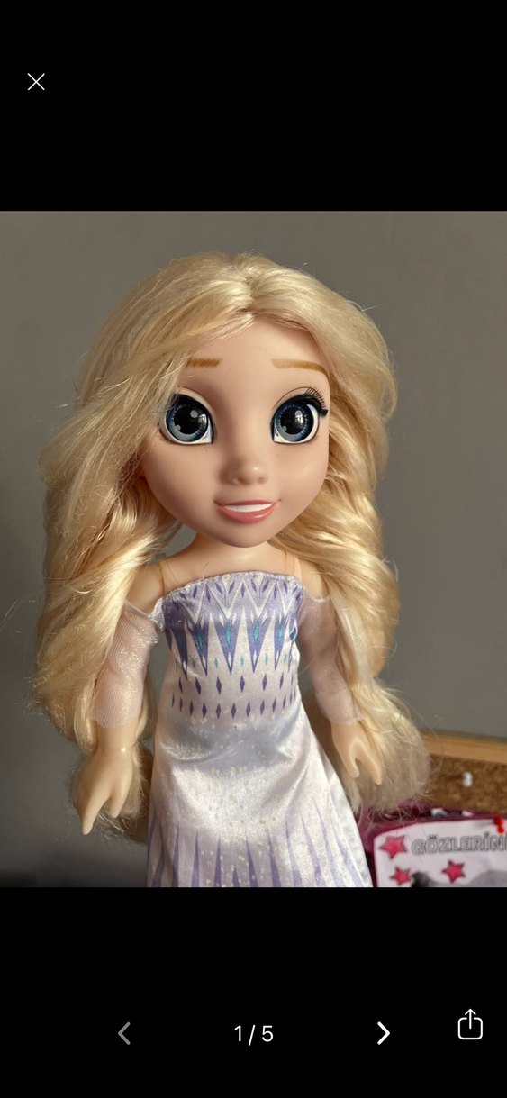 Uzun dalgalı saçlı, büyük mavi gözlü sarışın bebek, beyaz desenli elbise giymiş. #Elsa #Karlar ülkesi