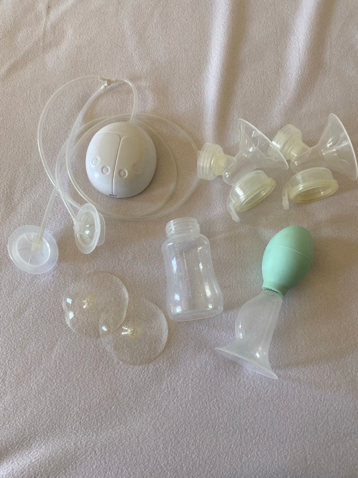 Beyaz elektrikli göğüs pompası seti, süt sağımı için çeşitli parçalar ve şişeler içerir. Yanında bir adet yeşil el sagım pmpası Ve 2 adet göğus korucu sılıkon koruyucu Samsung şarj aleti ile çalışır (şarj aleti dahıl degıl) Az kullanıldı sıkıntısı yoktur Sadece elektırıklı süt sagım pompasının güncel fiyatı 1500₺