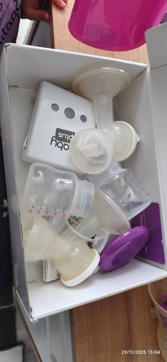 Beyaz renkli elektrikli göğüs pompası seti, çeşitli şişe ve aparatlar içerir. Kullanımı kolay kontroller ve kompakt tasarıma sahiptir.