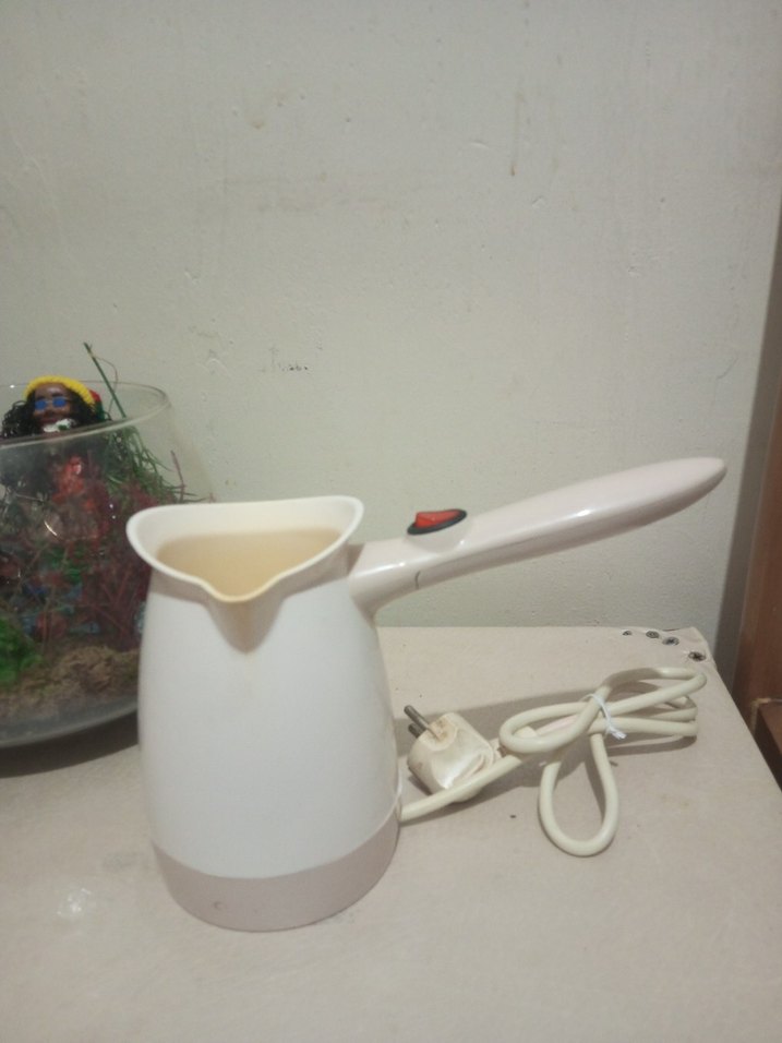 Uzun saplı, üzerinde açma-kapama düğmesi bulunan beyaz elektrikli kahve cezvesi. Hızlı kahve demlemek için uygun kompakt tasarım. ☕