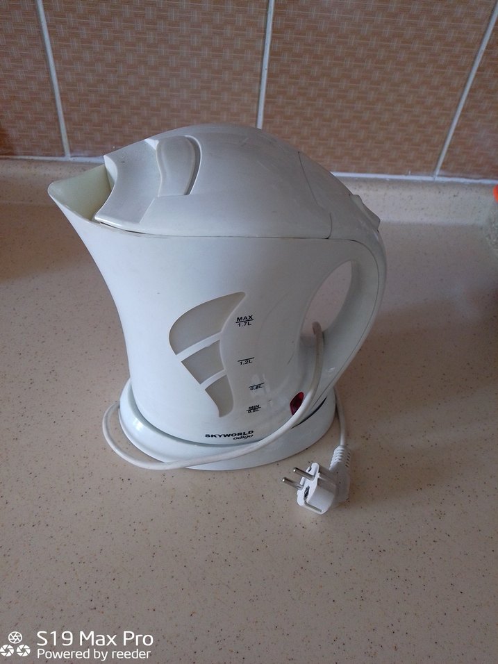 Şeffaf su seviyesi göstergesi ve ergonomik sapı bulunan beyaz elektrikli su ısıtıcısı. Tabanı ve prize takılan kablosu vardır.