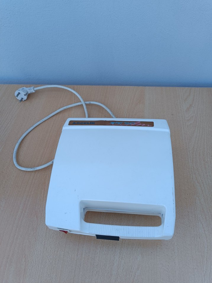 Kompakt tasarımlı beyaz elektrikli tost makinesi, hızlı tost için kullanışlı sap içerir.