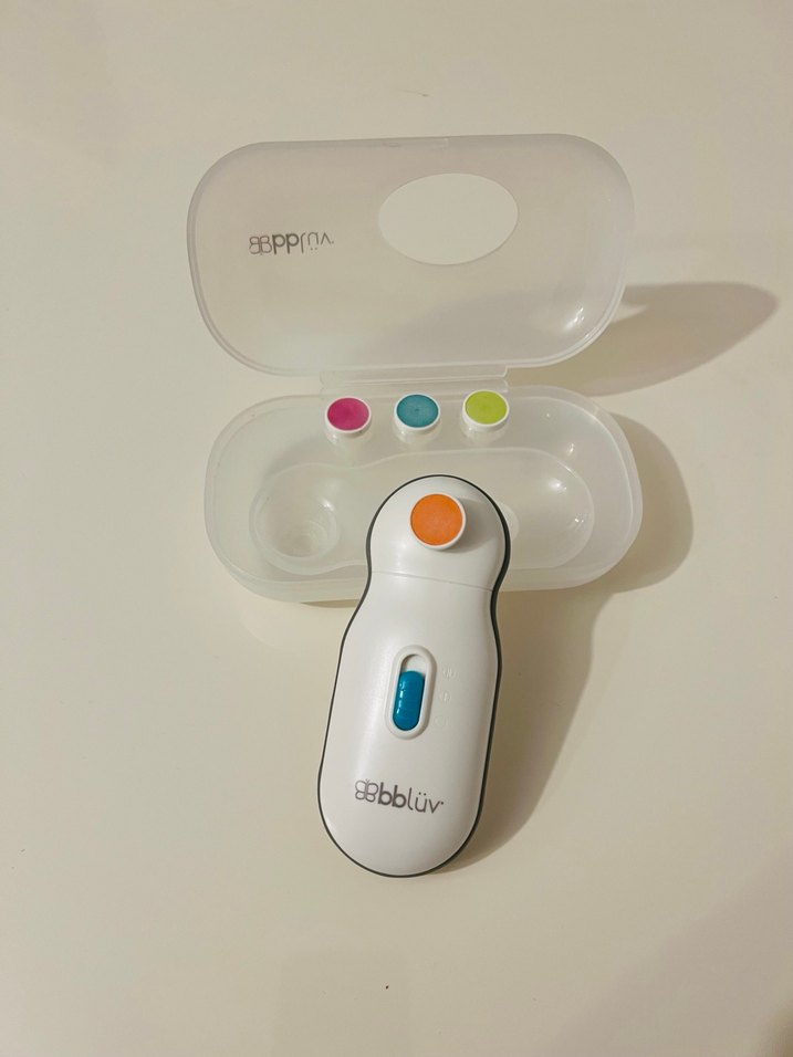 Beyaz elektrikli manikür ve pedikür aleti, üç renkli başlık ve şeffaf saklama kutusuyla birlikte. Üzerinde '8bblüv' yazısı bulunur.