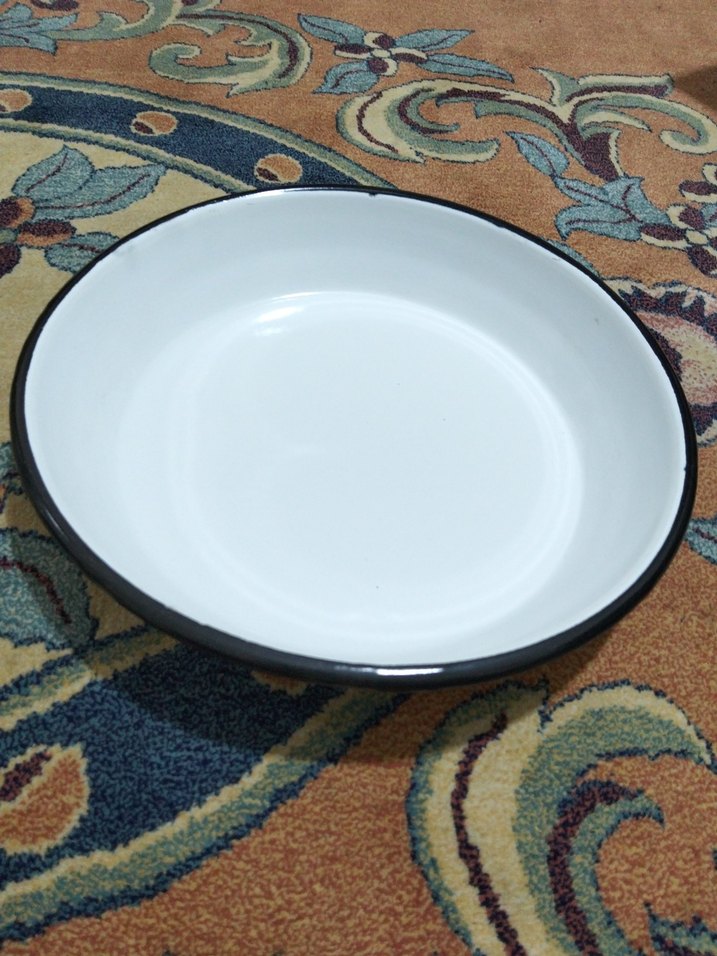 Koyu kenarlı beyaz emaye derin tabak, çeşitli yiyecekler için uygun basit tasarım sunar. ️