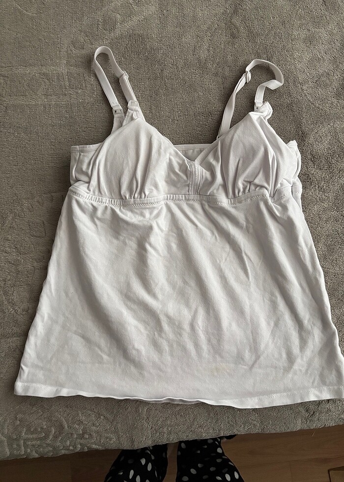 Beyaz emzirme atleti çıtçıtları sağlam. S-m bedenlere uygundur. Göğüs pedi vardır. Önünde bir leke var ama çok belli olmuyor.