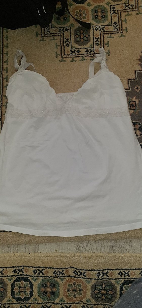 Ayarlanabilir askılı, beyaz renkte, desen içermeyen, midi boy ve bol kesim emzirme korsesi.