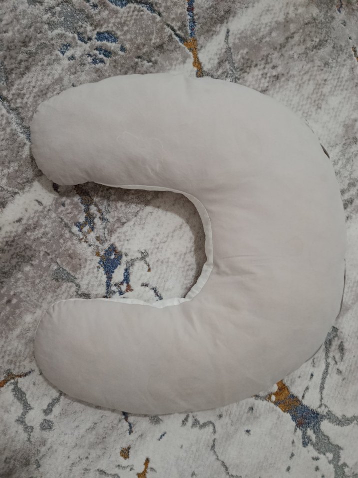 Yumuşak, düz kumaş kaplamalı beyaz hamilelik ve emzirme yastığı. Ergonomik destek için U şekline sahiptir. ️