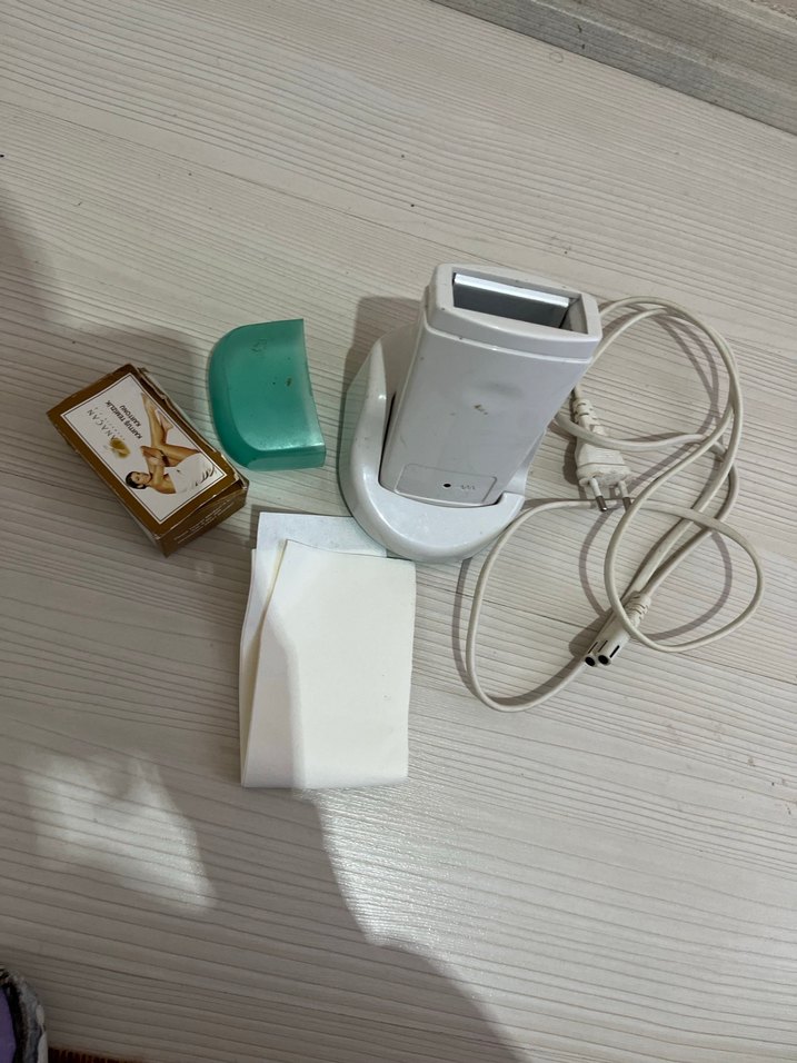 Şarjlı beyaz epilatör ve aksesuarları, ağda şeritleri ve küçük kutu dahil. Tüy alma için uygun. ⚡