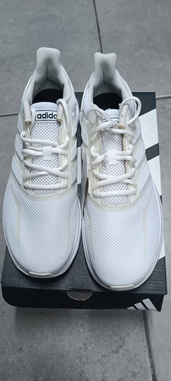 Nefes alabilir file üst yüzeyli, bağcıklı beyaz Adidas erkek koşu ayakkabısı, kauçuk tabanlı, spor ve sokak stili için uygun.