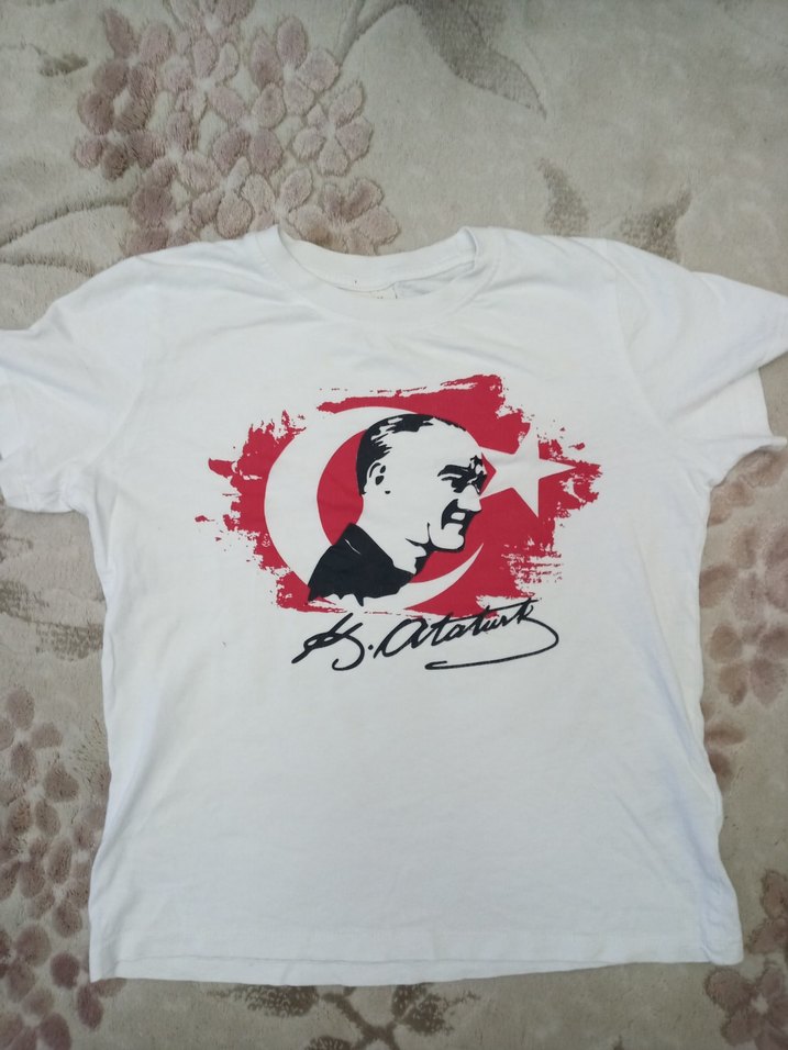 Pamuk kumaştan, kısa kollu, yuvarlak yaka, bol kesim beyaz tişört. Önünde Atatürk ve Türk bayrağı baskısı bulunur. Günlük kullanıma uygundur.