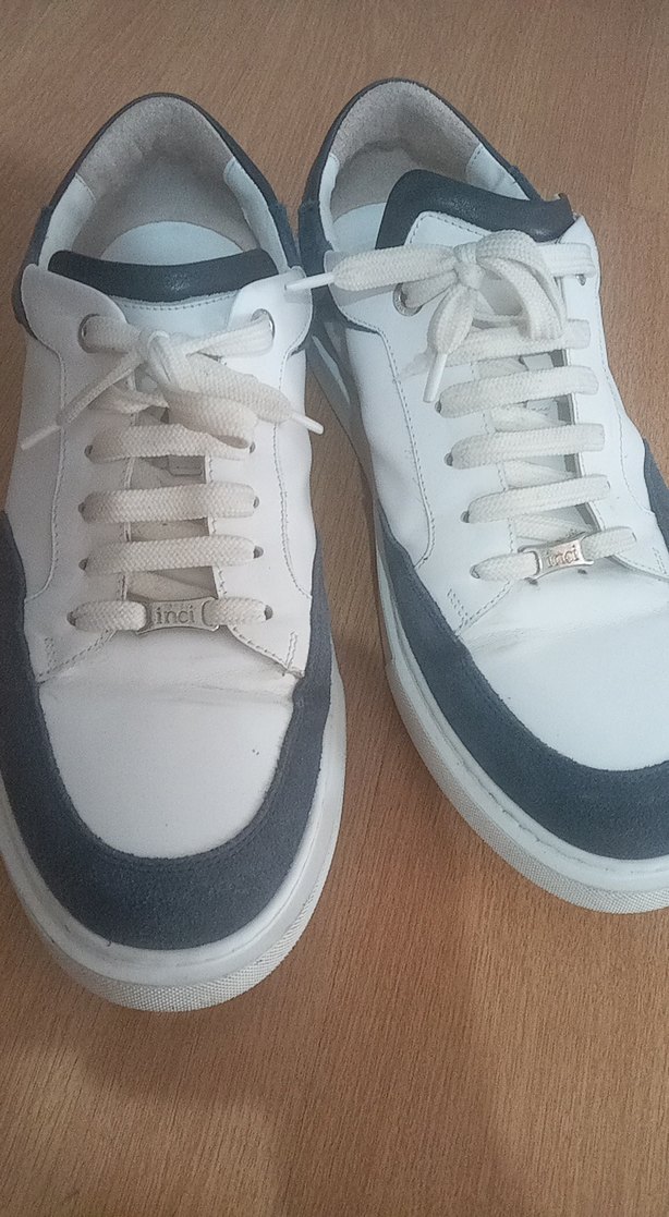 Sokak stiline uygun, gri detaylı beyaz erkek ayakkabı bağcıkları. Rahat ve günlük sneakerlar için ideal. incinin orjinal ayakkabı çok rahat tertemiz çok uygun fiyata sadece birkaç kez giyildi