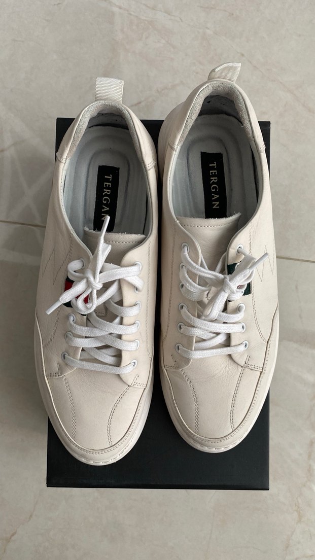 Tergan marka, sokak stiline uygun, açık renk beyaz erkek ayakkabı bağcıkları. Athleisure tarzına uyum sağlar.
