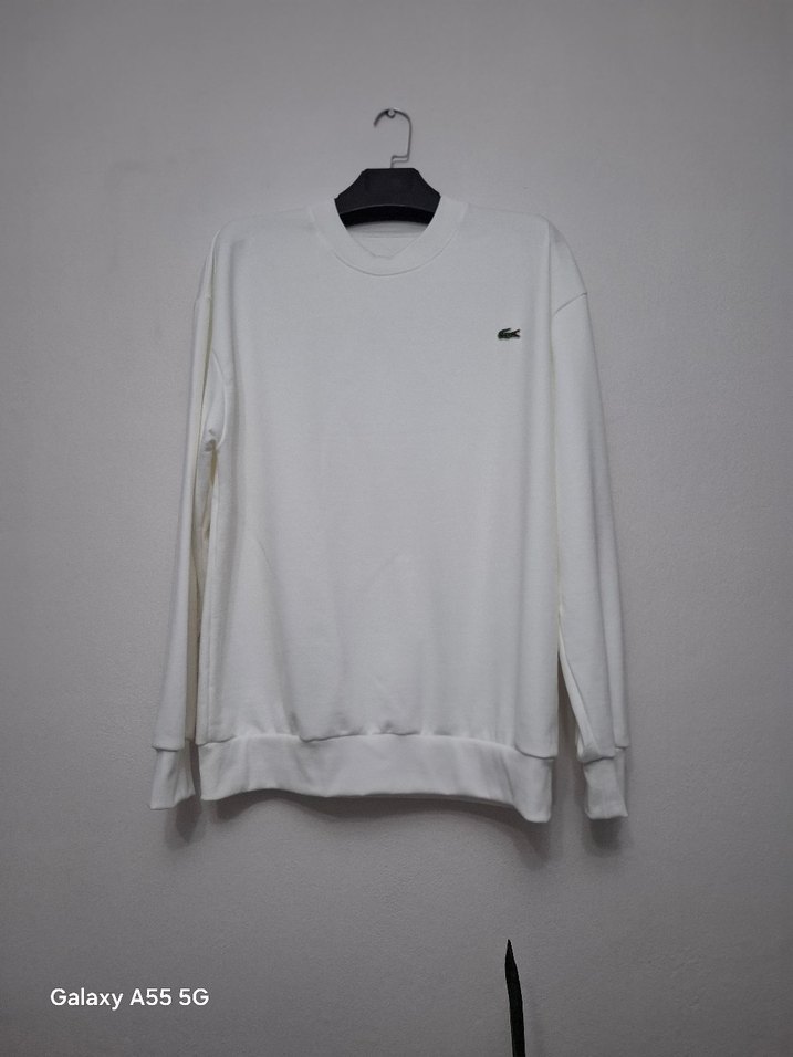 Beyaz, yuvarlak yaka ve uzun kollu erkek sweatshirtü, rahat kesim ve yumuşak kumaşla günlük kullanım için uygundur. Minimalist, desensiz ve sade logo detaylı.