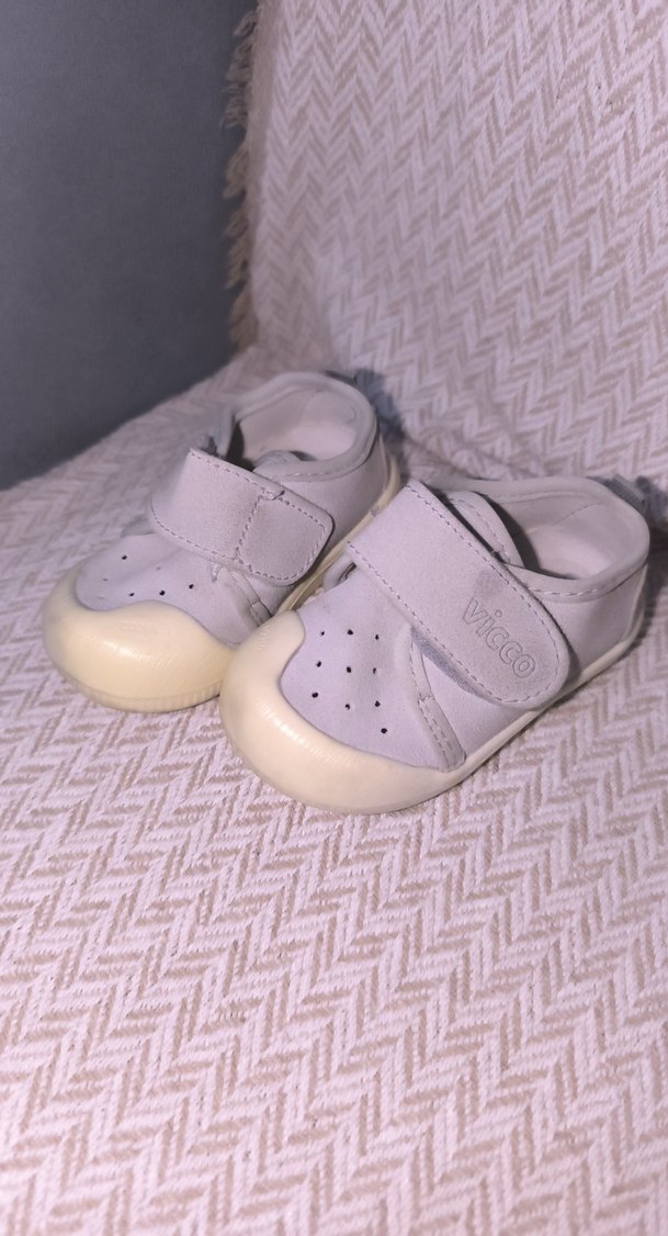 Cırt cırtlı, kauçuk tabanlı beyaz erkek bebek ilk adım ayakkabısı, sade ve desensiz pastel tonlarda.