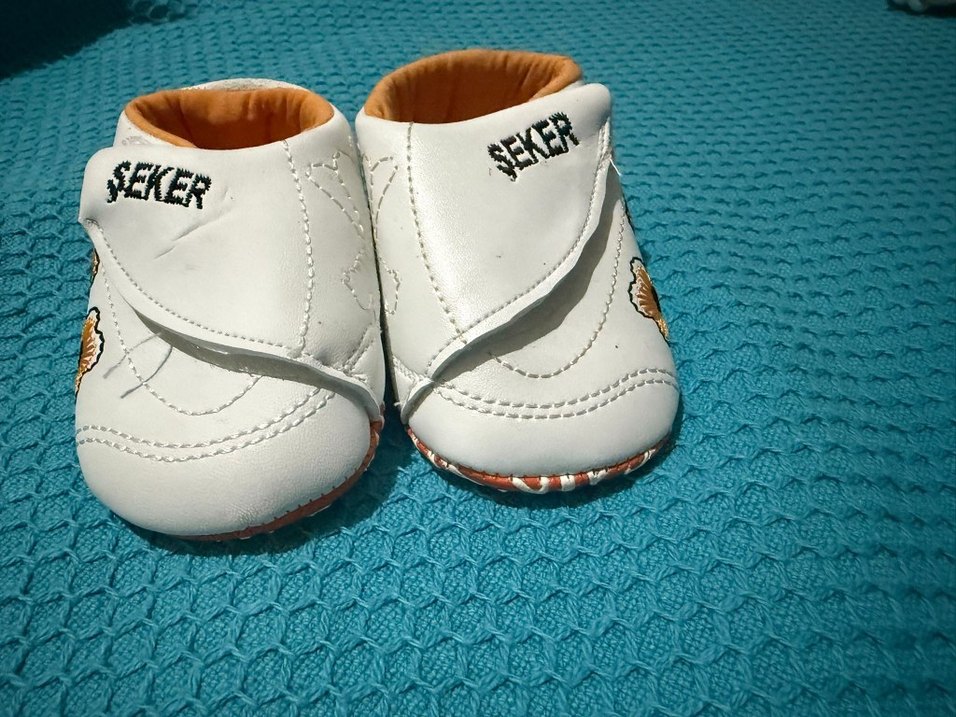 Beyaz, renkli nakışlı, cırt cırtlı erkek bebek ilk adım ayakkabısı. Rahat sokak stili için kauçuk malzeme kullanılmış. Üzerinde 'SEKER' nakışı bulunur. Numara çok küçük oldugu için katagoride çıkmadı oyuzden numara öylesine girilmiştir!